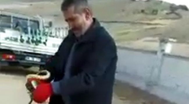 Yaklaşık 1.5 metre uzunluğundaki yılan ile oyuncak oynar gibi oynayan muhtar Bekir Ulusoy, bir süre sonra yılanı yeniden doğal yaşam alanına bıraktı.