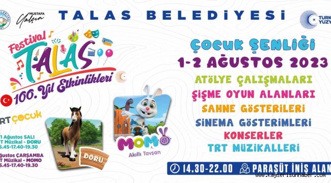 'Festival Talas 100. Yıl Etkinlikleri' adı altında yıl boyu gerçekleştirilecek programlar dizisinde Ağustos ayı, çocuklara özel şenlik ile başlayacak. 1-2 Ağustos tarihlerinde Talas Paraşüt İniş Alanı'nda gerçekleştirilecek şenlikte çocuklar ve aileleri eğlence dolu 2 gün geçirecek. Atölye çalışmalarından sahne gösterilerine, sinema gösterimlerinden konserler ve TRT müzikallerine kadar birçok aktivitenin çocuklarla buluşacağı organizasyonda ayrıca şişme oyun alanındaki birbirinden keyifli oyunlar çocukları bekliyor olacak. 1 Ağustos Salı ve 2 Ağustos Çarşamba günü saat 14.30'da başlayacak olan etkinlikler, saat 22.00'ye kadar devam edecek.