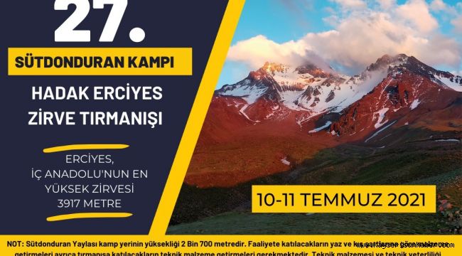 Geleneksel olarak düzenlenen Sütdonduran Kampı ve HADAK Erciyes Zirve Tırmanışı'nın 27.'si 10-11 Temmuz tarihleri arasında gerçekleştirilecek.