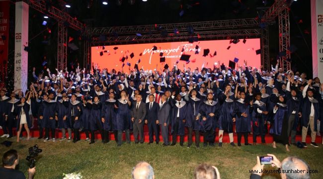 Diplomalarını alan öğrenciler sahnede hep birlikte keplerini havaya fırlatarak sevinç gösterilerinde bulundu.