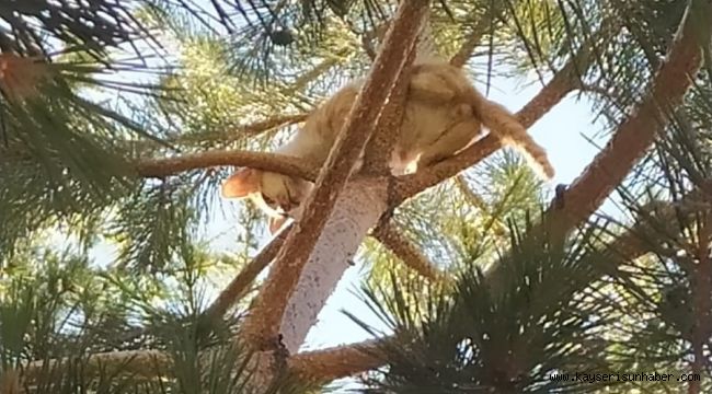 Kayseri'nin Develi ilçesinde ağaçta mahsur kalan kedi, belediye ekipleri tarafından kurtarıldı.