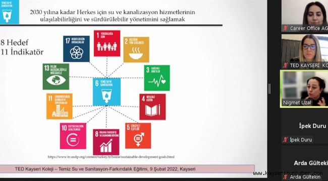 'Temiz Su Sanitasyon' konulu farkındalık eğitimi Abdullah Gül Üniversitesi İnşaat Mühendisliği Bölümü Öğretim Üyesi Prof. Dr. Niğmet Uzal tarafından 9. ve 10. sınıf öğrencilerine verildi. Tüm dünyada yoksulluğa son vermek, iklim değişikliği ile mücadele etmek, nitelikli eğitim, sorumlu üretim ve tüketimi yaygınlaştırmak gibi 17 ana başlıktan oluşan Birleşmiş Milletler (BM) Sürdürülebilir Kalkınma Hedefleri sosyal, kültürel ve ekolojik meselelerin çözümüne odaklanıyor.