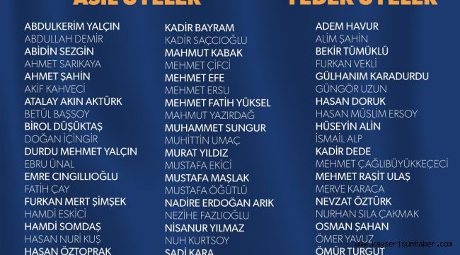 Listede Yedek Yönetim Kurulu Üyeleri olarak yer alan isimler de Ömür Turgut, Yasin Çalışkan, Nevzat Öztürk, Süleyman Karaköse,Hasan Müslim Ersoy, Ömer Yavuz, Osman Şahan, Furkan Vekli, özgür Galip Şahin, Nurhan Sıla Çakmak, Veli Çifci, Kadir Dede, Hüseyin Alin, Gülhanım Karadurdu, Mehmet Raşit Ulaş, Sümeyra Yılmaz Öztürk, Güngör Uzun, Seçkin Kumlu, İsmail Alp, Alim Şahin, Adem Havur, Mehmet Çağlıbüyükkeçeci, Merve Karaca, Hasan Doruk ve Bekir Tümüklü oldu.