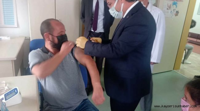 Kayseri'de aşı için aile sağlığı merkezine gelen bir vatandaşın aşısını İl Sağlık Müdürü Doç. Dr. Ali Ramazan Benli yaptı.