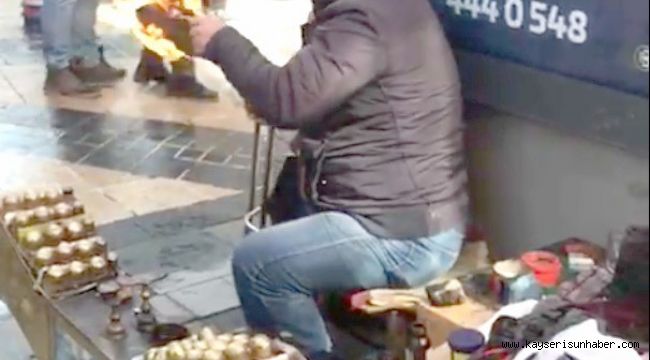 Kayseri'de ayakkabı boyacısı, boyadığı ayakkabının alev almasıyla zor anlar yaşadı.