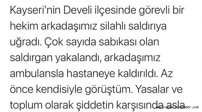 Öte yandan, Sağlık Bakanı Fahrettin Koca da konuyla ilgili yaptığı açıklamada, "Kayseri'nin Develi ilçesinde görevli bir hekim arkadaşımız silahlı saldırıya uğradı. Çok sayıda sabıkası olan saldırgan yakalandı, arkadaşımız ambulansla hastaneye kaldırıldı. Az önce kendisiyle görüştüm. Yasalar ev toplum olarak şiddetin karşısında asla aciz kalmayacağız" ifadelerini kullandı.