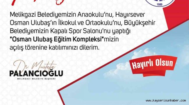 Melikgazi Belediyesi'nin Kazım Karabekir Mahallesi'nde bulunan anaokulunu, hayırsever Osman Ulubaş'ın 16 derslikli ilkokul ve ortaokulunu, Büyükşehir Belediyesi'nin ise kapalı spor salonunu yaptığı 16 bin metrekare alana sahip olan 'Osman Ulubaş Eğitim Kompleksi' Milli Eğitim Bakanı Mahmut Özer'in katılımı ile hizmete açılacak.