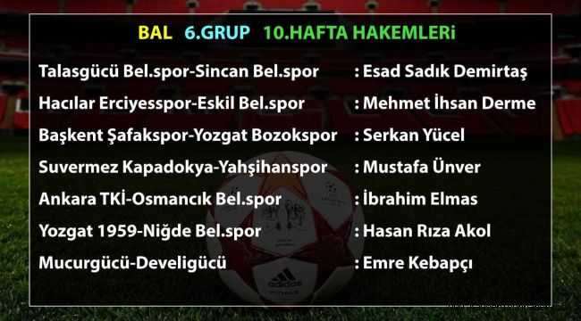Bölgesel Amatör Lig 6. Grup'ta oynanacak 10. hafta maçlarını yönetecek hakemler belli oldu. Haftanın en kritik müsabakalarından birisi olan Talasgücü Belediyespor ile Sincan Belediyespor arasında oynanacak maça Nevşehir bölgesi hakemi Esad Sadık Demirtaş atandı. Bu maçta Demirtaş'ın yardımcılıklarını Ali Rıza Kuzucu ile Burak Turunç yapacak.