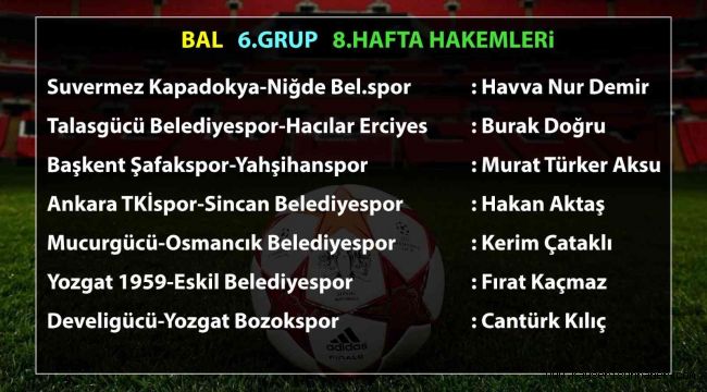 Bölgesel Amatör Lig 6. Grup 8. hafta maçlarında düdük çalacak hakemler ise şu şekilde:
