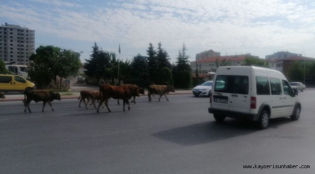 Kayseri'nin Melikgazi ilçesinde trafiğin yoğun olduğu caddede başıboş gezen büyükbaş hayvan sürüsü, sürücülere zor anlar yaşattı.Edinilen bilgiye göre, ilçeye bağlı Yeniköy...