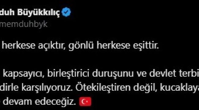 Başkan Büyükkılıç paylaşımında, "Devletin kapısı herkese açıktır, gönlü herkese eşittir. Sayın Valimizin kapsayıcı, birleştirici duruşunu ve devlet terbiyesine yakışır yaklaşımını takdirle karşılıyoruz. Ötekileştiren değil, kucaklayan bir anlayışla hizmet etmeye devam edeceğiz" ifadelerine yer verdi.