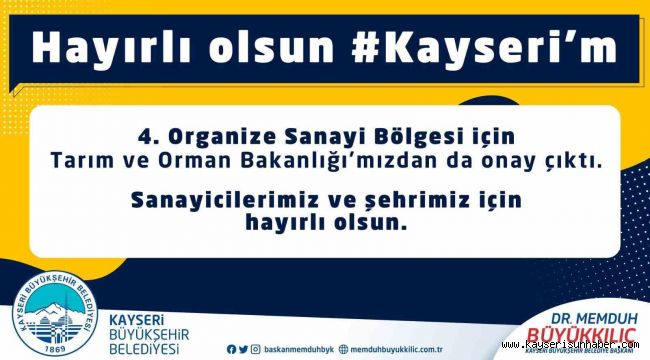 Kayseri Büyükşehir Belediye Başkanı Dr. Memduh Büyükkılıç, ticaretin, endüstrinin ve sanayinin merkezi Kayseri'ye bir müjde paylaşarak, "4'üncü Organize Sanayi Bölgesi için Tarım ve Orman Bakanlığı'mızdan da onay çıktı. Şehrimize ve sanayicimize hayırlı olsun" dedi.