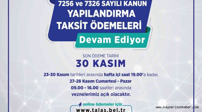 Talas Belediye Başkanı Mustafa Yalçın, Emlak ve Çevre Temizlik vergisinin 2. taksit ödemelerinin devam ettiğini belirterek ödeme için son tarihin 30 Kasım olduğu hatırlatmasında bulundu. Başkan Yalçın ayrıca daha önce yapılandırılmış vergilerin son ödeme gününün de 30 Kasım olduğuna dikkat çekti.