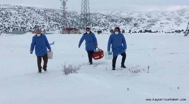 Kayseri'nin Sarız ilçesinde sağlık çalışanları, zorlu kış şartlarına rağmen bütün zorlukları aşarak yaşlıların aşılamasını yapıyor.