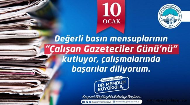 Kayseri Büyükşehir Belediye Başkanı Dr. Memduh Büyükkılıç, 10 Ocak Çalışan Gazeteciler Günü mesajında, "Basının gücü demek, bizim gücümüz demektir. Şehrimizde ne kadar güçlü basınımız olursa, bizlerde bir o kadar güçlü oluruz. Tüm basın çalışanlarının bu özel gününü kutluyor, en kalbi duygularımla selamlarımı gönderiyorum" dedi.