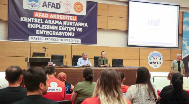 Kayseri Büyükşehir Belediyesi, AFAD Akrediteli Kentsel Arama Kurtarma Ekipleri kurmak için belediye personeline arama kurtarma eğitim semineri düzenledi. Seminerde eğitim alan personel ile bir araya gelen Başkan Büyükkılıç; "AFAD Akrediteli Kentsel Arama Kurtarma Ekiplerinin Eğitimi ve Entegrasyonu Semineri'ne katıldık. Büyükşehir Belediyemize bağlı iştiraklerimiz ve gönüllü personelimizle kurmayı planladığımız Kentsel Arama Kurtarma Ekiplerimizin ilk kursiyerleri Spor A.Ş.'mizin personeli oldu" diye konuştu. Büyükkılıç, eğitimlerini tamamlayan personeli sertifikalı AFAD Akrediteli Arama Kurtarma Ekibi olarak Büyükşehir Belediyesi bünyesinde bulunduracaklarını ifade etti.
