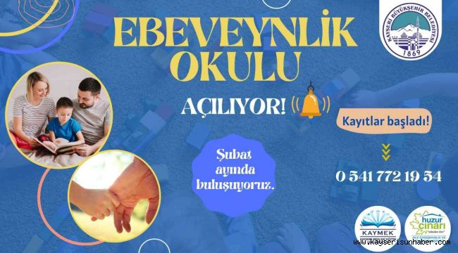 Kayseri Büyükşehir Belediyesi bünyesinde faaliyetlerini yürüten Kayseri Mesleki Eğitim ve Kültür A.Ş.'nin (KAYMEK) Huzur Çınarı Aile Danışmanlık ve Rehberlik Merkezi tarafından anne, baba ve çocukların katılacağı 3 haftalık Ebeveynlik Okulu açacak.