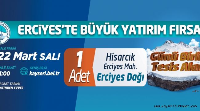 Kayseri Büyükşehir Belediyesi tarafından Melikgazi ilçesi, Hisarcık-Erciyes Mahallesi'nde bulunan Günü Birlik Tesis Alanı "Kapalı Teklif Usulü" ihale ile satışa çıkarılacak.