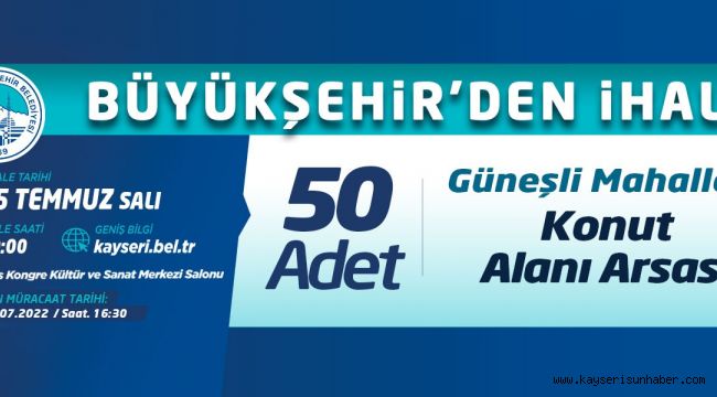 Kayseri Büyükşehir Belediyesi tarafından Kocasinan İlçesi, Güneşli Mahallesi'nde bulunan 50 adet Konut Alanı Arsası 'Açık Teklif Usulü' ihale ile ayrı ayrı satışa çıkarılacak. İhale, 5 Temmuz Salı günü saat 10.00'da Büyükşehir Belediyesi Kadir Has Kongre Kültür ve Sanat Merkezi Salonu'nda gerçekleştirilecek.