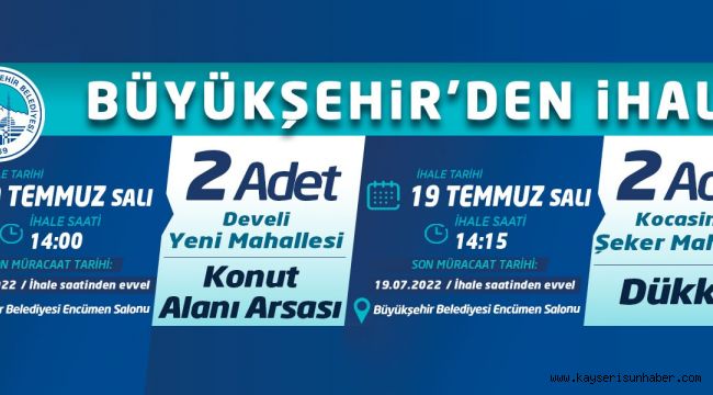 Kayseri Büyükşehir Belediyesi tarafından Develi'de konut alanı arsası ile Kocasinan ilçesindeki konut ve dükkânlar 'Açık Teklif Usulü' ihale ile ayrı ayrı satışa çıkarılacak.