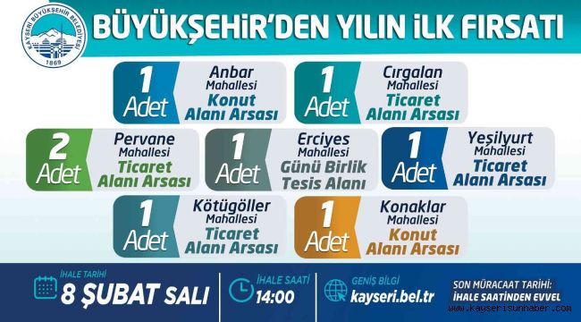 Kayseri Büyükşehir Belediyesi tarafından şehrin muhtelif yerlerinde bulunan toplam 8 adet arsa, düzenlenecek 2 ayrı ihale ile satılacak.