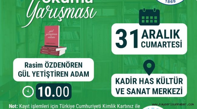 Kayseri Büyükşehir Belediyesi bünyesinde faaliyetlerini yürüten Kayseri Mesleki Eğitim ve Kültür A.Ş. (KAYMEK) vatandaşlara yönelik "Kitap Seç, Oku, Yarış, Kazan" sloganıyla ödüllü kitap okuma yarışması 31 Aralık Cumartesi gerçekleşecek.