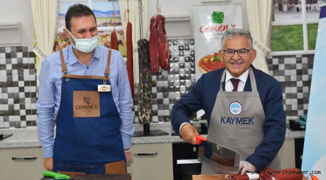 Mutfak önlüğünü giyen Başkan Büyükkılıç eldivenlerini de takarak pastırma doğradı ve uzmanından pastırma doğraması ile ilgili incelikleri ve detayları öğrendi. Başkan Büyükkılıç, eşi Necmiye Büyükkılıç'a da pastırma ikram etti.