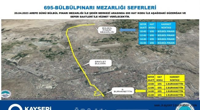 Yine Erkilet Bülbül Pınarı Mezarlığı ile Şehir Merkezi arasında 695 hat kodu ile otobüs seferleri düzenleneceğini ifade eden Büyükkılıç, bu hatta hareket noktasının Seyyid Burhaneddin olan saat 10.00, 12.00, 14.00 ve 16.00 olarak belirlendiğini, yine dönüşlerde hareket noktası Bülbül Pınarı Mezarlığı'ndan saat 10.45, 12.45, 14.45 ve 16.45 olarak düzenlendiğini ifade etti.