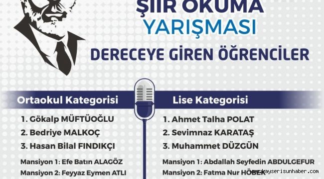 Kayseri Büyükşehir Belediyesi bünyesindeki KAYMEK A.Ş. tarafından düzenlenen ve 781 ortaokul, 234 lise öğrencisi olmak üzere toplam bin 15 öğrenci katıldığı 'Asım'ın Nesli, Akif'in Şiirlerine Ses Veriyor' Şiir Okuma Yarışması sonuçları açıklandı.