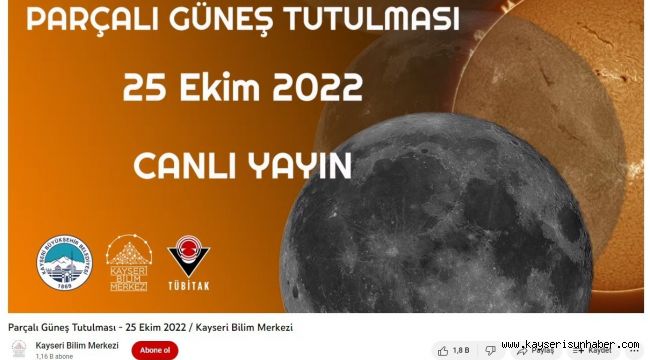 Kayseri Büyükşehir Belediyesi Bilim Merkezi, en önemli gök olaylarından kabul edilen ve uzun süredir beklenen parçalı güneş tutulması gök olaylarını sosyal medya kanalından canlı olarak yayınladı. Canlı yayına 202 bin kişi katılarak, parçalı güneş tutulması heyecanını doya doya yaşadı.
