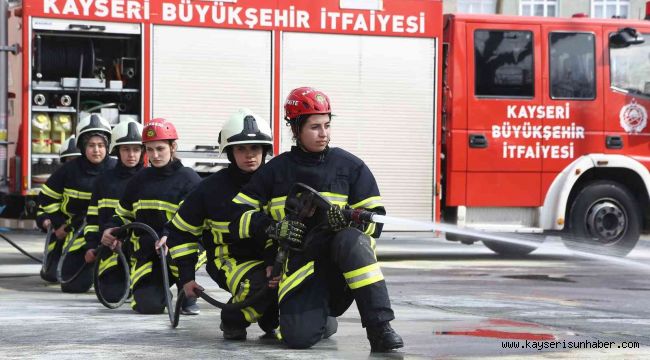 Kayseri Büyükşehir Belediyesi İtfaiye Daire Başkanlığı'nda kadın itfaiyeci adayı olan 6 öğrenci, usta itfaiyeciler tarafından birbirinden zorlu eğitimin yanı sıra, yangın ve afet kurtarma tatbikatı ile mesleğe hazırlanıyor.