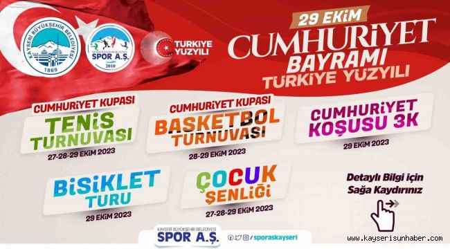 Başkan Dr. Memduh Büyükkılıç yönetimindeki Kayseri Büyükşehir Belediyesi, kültür, sanat ve spor alanında takdir toplayan hizmetlerini özel gün ve haftalarda da Kayserililerle buluşturmayı sürdürüyor. Bu çerçevede, tüm yurtta büyük bir coşkuyla 100'üncü yılı kutlanacak 29 Ekim Cumhuriyet Bayramı çerçevesinde çalışmalar yapan Büyükşehir Belediyesi Spor A.Ş. Kayserilileri büyük bir heyecan, rekabet ve coşkuya sahne olacak spor etkinlikleri ile buluşturuyor. Spor A.Ş. ailesi 29 Ekim Cumhuriyet Bayramı'na özel "Türkiye Yüzyılı" teması ile Recep Tayyip Erdoğan Millet Bahçesi Tenis Kortu'nda Tenis Turnuvası düzenliyor. Ayrıca Recep Tayyip Erdoğan Millet Bahçesi Basketbol Sahası'nda 3x3 Basketbol Turnuvası gerçekleştirecek olan Spor A.Ş. yine Recep Tayyip Erdoğan Millet Bahçesi'nde çocuk ve yetişkin olmak üzere iki kategoride Cumhuriyet Koşusu düzenliyor. RHG Enertürk Enerji Stadyumu'ndan başlayıp, Recep Tayyip Erdoğan Millet Bahçesi'nde bitmek üzere Bisiklet Turu da düzenleyecek olan Spor A.Ş. ekipleri, çocukları da unutmayarak, şişme, ahşap, çocuk oyun alanları ile sahne gösterilerinin yer alacağı Çocuk Şenliği de gerçekleştiriyor.