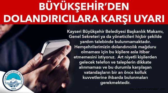 Kayseri Büyükşehir Belediyesi'nden yapılan açıklamada, art niyetli bazı kişilerin zaman zaman Kayseri Büyükşehir Belediyesi ya da bazı üst düzey yetkili ve bürokratların ismini kullanarak yardım veya bağış amaçlı para talebinde bulunduklarının tespit edildiği belirtildi.