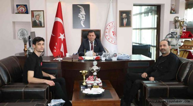 3 Bant Bilardo Türkiye Şampiyonası'nda Gençler kategorisinde Türkiye üçüncüsü olan Kayserili sporcu Alptekin Canözkan, İl Müdürü Ali İhsan Kabakcı'yı makamında ziyaret etti.
