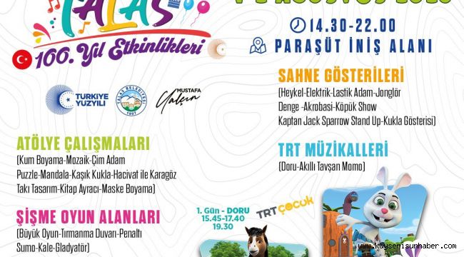 1-2 Ağustos tarihlerinde Talas Paraşüt İniş Alanı'nda gerçekleştirilecek şenlikte çocuklar ve aileleri dolu dolu 2 gün geçirecek. Atölye çalışmalarından sahne gösterilerine, sinema gösterimlerinden konserler ve TRT müzikallerine kadar birçok aktivitenin çocuklarla buluşacağı organizasyonda ayrıca şişme oyun alanındaki birbirinden keyifli oyunlar çocukları bekliyor olacak. Tamamı ücretsiz olacak etkinlikler, 1 Ağustos Salı ve 2 Ağustos Çarşamba günü saat 14.30'da başlayacak ve 22.00'ye kadar devam edecek. Konuya ilişkin bir değerlendirme yapan Talas Belediye Başkanı Mustafa Yalçın, cumhuriyetin 100 yılını kutladıklarına dikkat çekerek "Cumhuriyetimiz 100 yaşında ve biz bunun gururunu yaşıyoruz. Bununla birlikte 100. yılı anlamlı kılmak ve coşkulu şekilde kutlamak amacıyla birçok etkinlik ve açılış planladık. Bu çerçevede birbirinden önemli tesis ve yatırımları hizmete açacağız. Bununla birlikte her yaşa ve her kesime hitap eden organizasyonlarımız olacak. 1 ve 2 Ağustos'ta çocuklarımız için iki günlük bir şenlik düzenliyoruz. Hem gönüllerince eğlenecekler hem de bilgi sahibi olacaklar. Tüm çocuklarımızı ve ailelerini, Paraşüt İniş Alanına bekliyoruz" dedi.