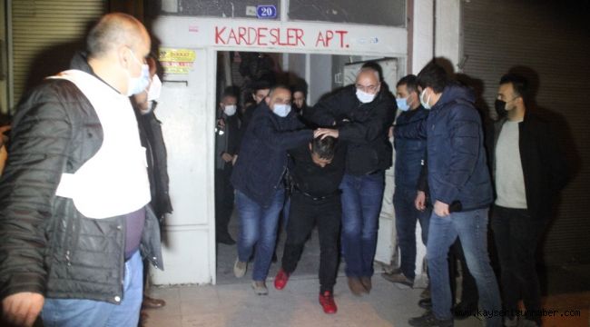 Kayseri'nin Melikgazi ilçesinde boşandığı eşini çocuklarının gözü önünde tabancayla vurup öldürdükten sonra kaçan şahıs, polis özel harekatında katıldığı operasyonla kıskıvrak yakalandı. Şahsın saklandığı evin kapısı koçbaşı ile kırılırken, silah ele geçirildi.