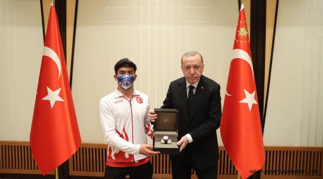Cumhurbaşkanı Recep Tayyip Erdoğan Kayserili Şampiyon Cimnastik sporcusu Mert Efe Kılıçer'i Cumhurbaşkanlığı Külliyesinde kabul ederek ödüllendirdi.