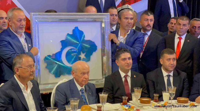 Konuşmaların ardından Doğu Türkistanlılar adına Devlet Bahçeli'ye Gökbayrak temalı Doğu Türkistan Haritası armağan edildi.