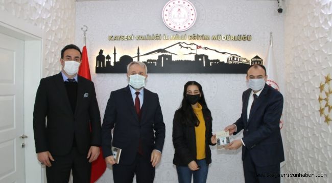 Cansu Türkmen, çıkardığı ilk kitabını Milli Eğitim Müdürü Bilal Yılmaz Çandıroğlu ile İl Müftüsü Prof. Dr. Şahin Güven'e hediye etti.