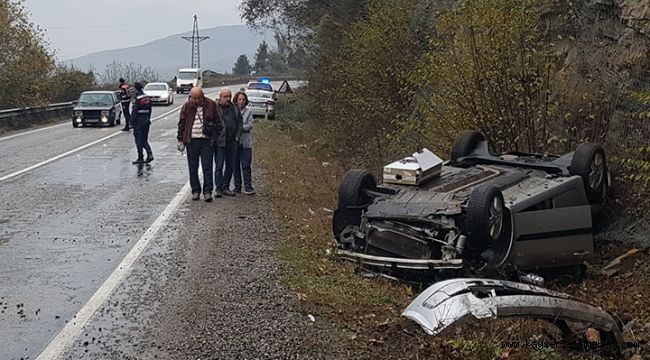 Karabük'ün Yenice ilçesinde meydana gelen trafik kazasında otomobil takla attı. Emniyet kemeri takılı olan otomobildekiler kazadan yara almadan kurtuldu.