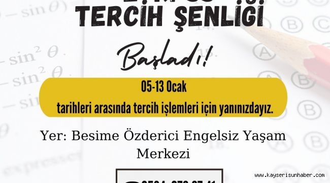 Kayseri Büyükşehir Belediyesi'nin hayata geçirdiği Türkiye'nin en geniş çaplı engelsiz yaşam merkezi Besime Özderici Engelsiz Yaşam Merkezi, özel vatandaşlara sunduğu sağlık hizmetinin yanı sıra çok yönlü eğitim hizmeti çerçevesinde 'Hayallerinize ulaşmak için birlikte karar verelim' sloganıyla E-KPSS Tercih Şenliği'ni başlattı.