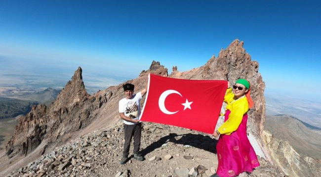 Erciyes’in zirvesinde yerel kıyafetlerinden de giyen Profesör Eunsuk Cho, beraberindeki dağcılar ile birlikte Türk Bayrağı açtı ve zirve defterine de duygularını aktardı.
