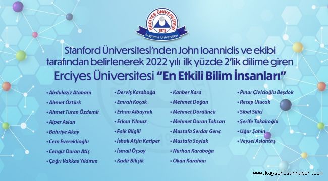 Stanford Üniversitesi'nden John Ioannidis ve ekibi tarafından; yayın sayıları, atıf sayıları, h-indeksi, hm-indeksleri gibi farklı değişkenler kullanılarak oluşturulan ve PLOS Biology dergisinde yayımlanan 2022 yılı ilk yüzde 2'lik dilime giren 'En Etkili Bilim İnsanları' listesi açıklandı. Açıklanan listeye göre Erciyes Üniversitesi'nden (ERÜ) 30 öğretim üyesi listeye girme başarısı gösterdi.