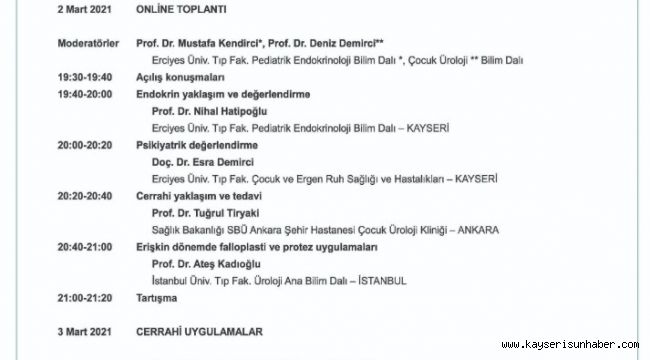 Türk Üroloji Derneği'nin katkılarıyla Erciyes Üniversitesi Tıp Fakültesi'nin ev sahipliğinde düzenlenecek olan 'Cinsel Gelişim Bozukluğu Olan Olguların Yönetimi' Toplantısı 2-3 Mart tarihlerinde online olarak yapılacak. 2 Mart'ta 'endokrin yaklaşım ve değerlendirme', 'cerrahi uygulamalar' olarak iki oturumda yapılacak olan toplantının moderatörlüğünü ise Prof. Dr. Mustafa Kendirci ve Prof. Dr. Deniz Demirci yapacak.