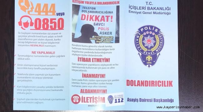 Kayseri İl Emniyet Müdürlüğü Asayiş Şube Müdürlüğü Yankesicilik ve Dolandırıcılık Büro Amirliği'nce vatandaşlar dolandırıcılık konularında bilgilendirildi. Ayrıca esnaf görünümlü güven timlerince suçlar gerçekleşmeden önlendi.