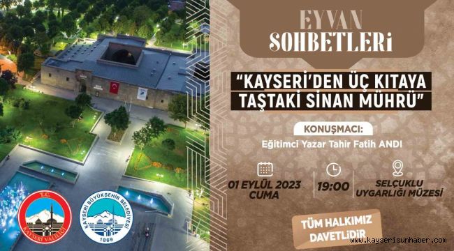 Kayseri'nin değerlerini, sahip olduğu özelliklerini, kültür ve tarihini konu alan Eyvan Sohbetleri programı, kadim kentin önemli değerlerini tanıtmaya ve farklı, çarpıcı yönler ile anlatmaya devam ediyor. Bu istikamette Kayseri'den dünyaya açılarak döneme ve dünyaya mimari konusunda damga vuran, 'Koca Sinan' olarak da bilinen Mimar Sinan'ı konu alan Eyvan Sohbetleri, Kayserililerle buluşacak. Eyvan Sohbetleri'nde bu kez katılımcılarına Mimar Sinan'ı anlatacak olan konuşmacı Eğitimci Yazar Tahir Fatih Andı, 'Kayseri'den Üç Kıtaya Taştaki Sinan Mührü' başlıklı konu ile ünlü mimarın hayatına ve eserlerine dair bilgiler paylaşacak.