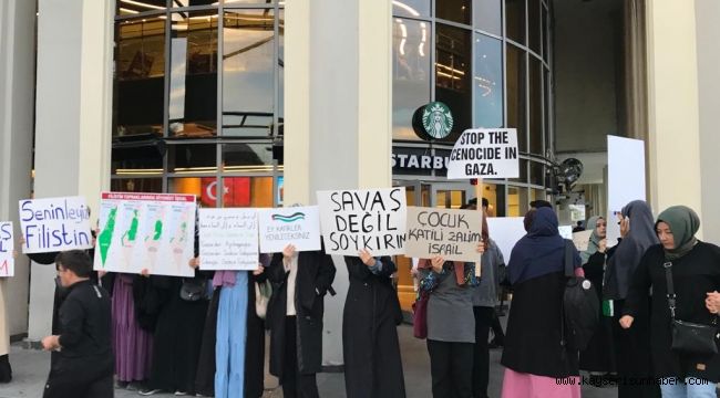 Kayseri Cumhuriyet Meydanı'nda bulunan bir AVM'nin zemin katındaki Starbucks kafenin önüne ellerinde pankart ve dövizlerle gelen genç kızlar, İsrail vahşetine destek olan Starbucks firmasını protesto etti. Bu duyarlılık karşısında bazı müşterileri de kafeyi terk etti.
