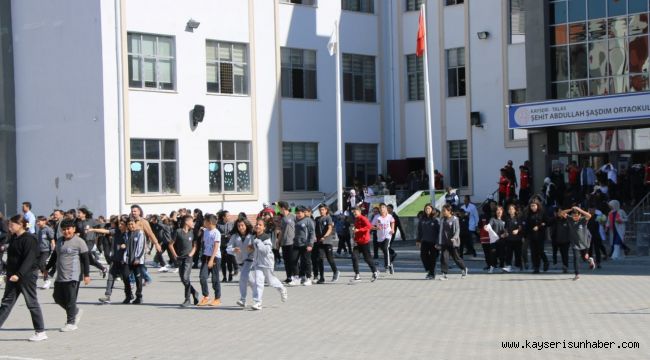 İl Milli Eğitim Müdürlüğü, AFAD, Kayseri Büyükşehir Belediyesi İtfaiye Daire Başkanlığı, MEB AKUB ve ANDA ekiplerinin katılımlarıyla Talas ilçesinde bulunan Abdullah Şaşdım Ortaokulunda Dünya Afet Risklerinin Azaltılma Günü nedeniyle yangın tatbikatı düzenlendi. Tatbikatta, okulda çıkan yangın üzerine okul alarmının çalmasıyla okulda bulunan tüm öğrenciler sınıfları boşaltarak okul bahçesinde toplandı. Daha sonra olay yerine gelen itfaiye ekipleri, itfaiye merdivenleri yardımıyla yangında mahsur kalan öğrenciyi tahliye etti. Dumandan etkilenen ve yaralanan öğrenciler de alanda bekletilen ambulansla hastaneye sevk edildi. Öğrenciler tatbikatı meraklı gözlerle izlerken, jandarma arama kurtarma köpeklerinin düzenlediği gösteri de yoğun ilgi gördü.