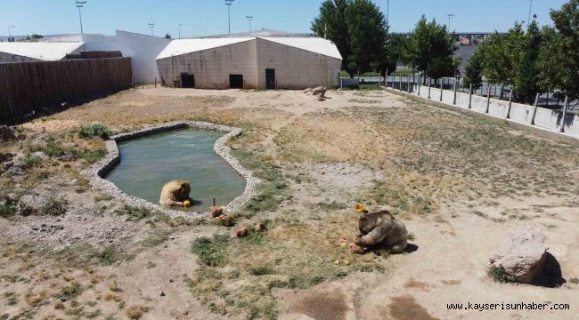 Bacak, Büyükşehir Belediyesi Hayvanat Bahçesi'nde 153 türde bin 600 hayvana bakım ve besleme yaptıklarını belirterek, "Hayvanat bahçemiz 181 bin metrekare alana kurulu 153 türden bin 600'e yakın hayvanı barındırmaktadır. Kayseri'mizde de şu an havalar sıcak, 30-35 derece aralığında seyrediyor. Bununla ilgili de hayvanlarımızın sağlıklarını koruma adına çeşitli aktiviteler yapıyoruz, şu anda da ayı barınağımızın önündeyiz. Ayılarımıza haftanın belirli günlerinde ve belirli saatlerinde sağlıklarını sıkıntıya sokmayacak derecede soğuk meyve suyu kokteyli veriyoruz. Gördüğünüz gibi havuz başında şu an ayılarımız soğuk meyve kokteyli keyfi yapıyorlar. Hayvanlarımız gayet rahatlar, huzurlular sadece ayılar için değil aslanlarımız, kaplanlarımız, flamingolar, su kuşları, diğer hayvanlarımızın da havuzları ve serinletme sistemleri var. Misafirlerimiz gayet sağlıklılar" şeklinde konuştu.