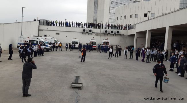 Kayseri Şehir Hastanesi çalışanlarına afet ve yangın farkındalık eğitimi verildi. Çalışanların bir çoğu eğitimi hastanenin duvarından meraklı gözlerle izledi.